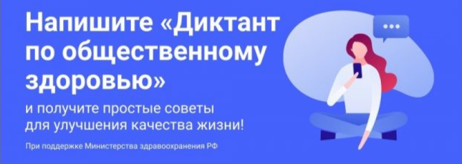 Министерство здравоохранения Российской Федерации в рамках реализации федерального проекта «Укрепления общественного здоровья» национального проекта «Демография» и в целях повышения общей грамотности населения в сфере профилактики неинфекционных заболеваний, а также популяризации здорового образа жизни среди всех групп населения проводит Всероссийский диктант по общественному здоровью.